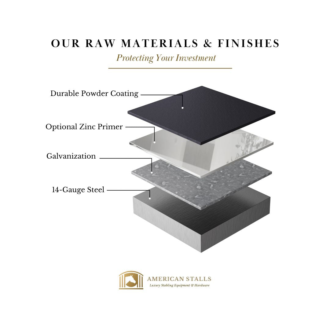 We believe this is a significant differentiator where we take multiple steps to clean and prime our pre-galvanized products prior to powder coat. We then powder coat each component from experts who have years of experience. Lastly, we utilize an industry-leading TGIC polyester-based powder coat finish that is tested for ultimate performance. Rest assured, your American Stalls products will stand the test of time.